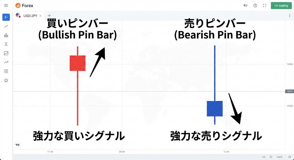 - 買いのピンバー(ブルピンバー): 下に非常に長いヒゲがあり、売りが一気に押し戻され、買いの勢力が勝利したことを示す。→ 買いエントリーの準備。