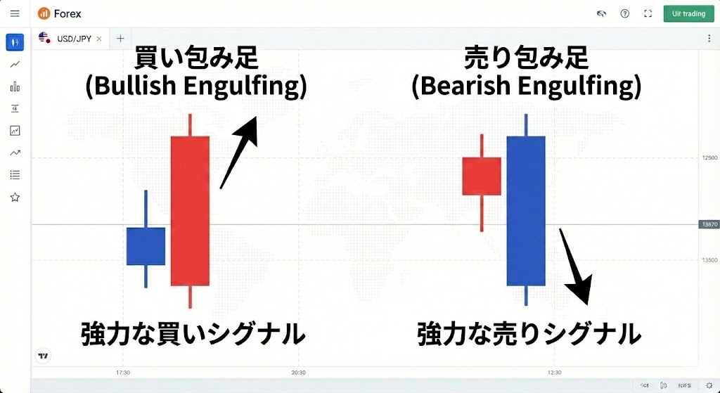 - 直前の陰線(売りのローソク足)の実体を、現在の陽線(買いのローソク足)の実体が完全に包み込む。