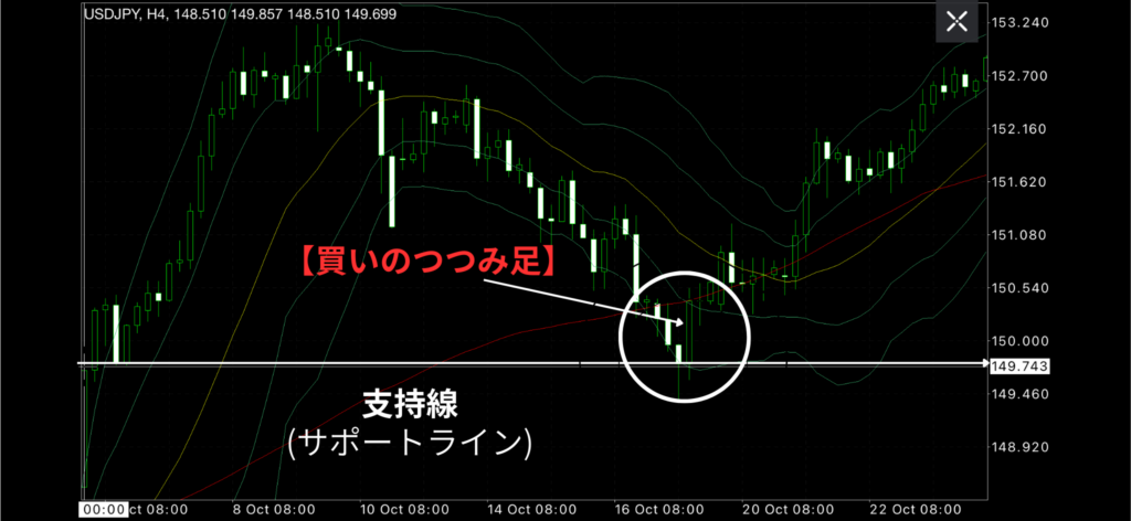 - 支持線(サポートライン): 下落が止められてきた下限ライン。ここで買いのピンバーや買いのつつみ足が出現したら、非常に強力な反転のサインとなります。