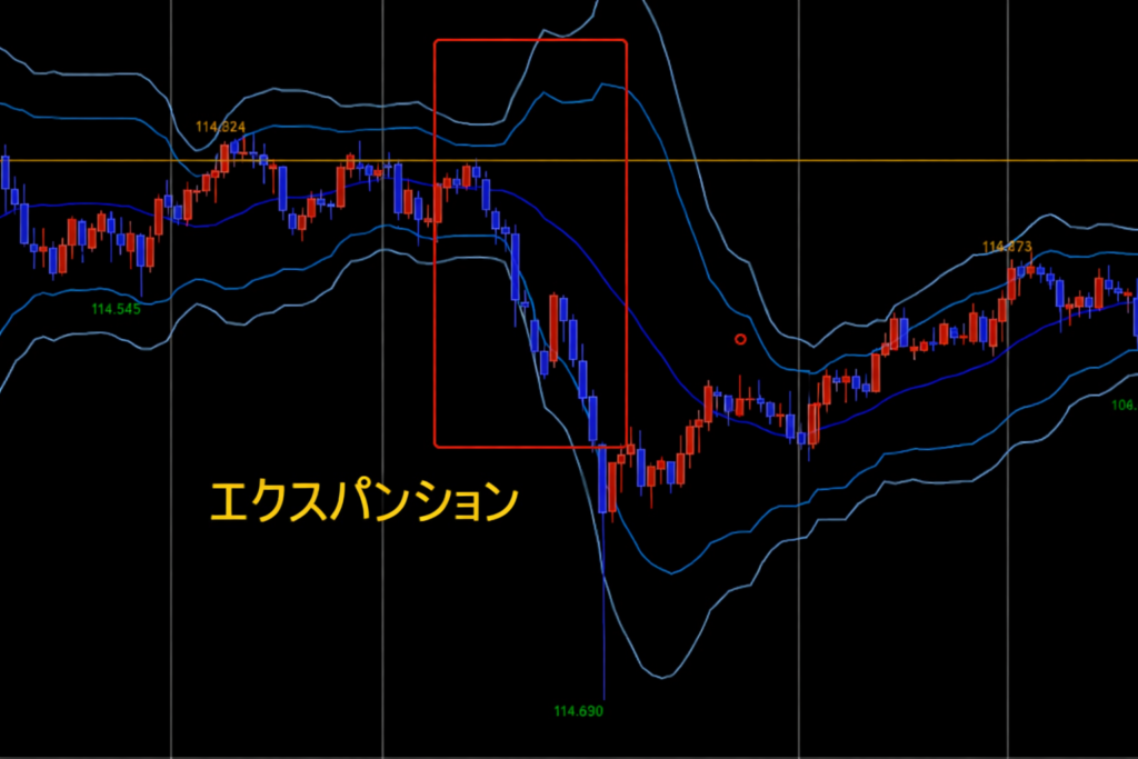 - エクスパンション(拡大): バンド幅が急激に広がっている状態。強いトレンドが発生し始めたサインであり、この状況での逆張りは絶対に避ける必要があります(バンドウォーク)。