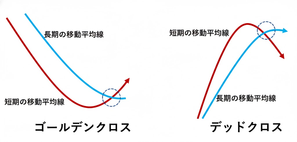 ゴールデンクロスは、短期的な平均値が長期的な平均値を上回り始めたことを意味し、これが「買いの勢いが強くなってきた」こと、すなわち「上昇トレンドが始まった」可能性を示すと解釈されます。